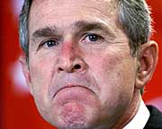 Bei seinem Rachefeldzug wegen der Anschläge auf WTC und Pentagon nimmt er sog. "Kollateralschäden" in Kauf. Die Terroristen, die diese Anschläge verübten, bezeichnete er als feige, schickte seine Soldaten jedoch nach Afghanistan um aus sicherer Entfernung mit überlegenen Waffen die Taliban und die Zivilbevölkerung hinzumetzeln. Bereits Ende Dezember 2001 gab es unter der afghanischen Zivilbevölkerung mehr Opfer als am 11.9.2001 in den USA. Die gefangenen Talibankämpfer erhalten nicht den Status von Kriegsgefangenen, obwohl er ja einen "Krieg gegen den Terror" führt. Bleibt die andere Möglichkeit: Sie werden wie Zivilisten behandelt. Das ist auch nicht der Fall, es ist sogar geplant, Sondergerichte einzurichten, bei denen die Öffentlichkeit ausgeschlossen ist und es nach dem Richterspruch nicht die Möglichkeit einer Berufung gibt. Wegen solcher Zustände wurden in der Vergangenheit immer Staaten vom Kaliber Libyens kritisiert - USA - wie tief seid ihr gesunken! Weil Bush innenpolitisch in der Zwischenzeit keine Punkte gemacht hat und seine Soldaten eh schon unterwegs sind, hat er sich weitere wehrlose Angriffsziele ausgedacht. Obwohl die UNO-Waffeninspekteure wieder in den Irak dürfen, plant er derzeit einen Krieg gegen den privaten Erzfeind der Familie Bush, Saddam Hussein, ausdrücklich notfalls ohne die Unterstützung durch die UNO. Wenn das geschieht, müßte man ihn eigentlich wegen Führen eines Angriffskrieges und Massenmord an der irakischen Zivilbevölkerung (und nichts anderes wird das werden) zu einer hohen Freiheitsstrafe verurteilen können. Nur wer traut sich das? Seit der internationale Strafgerichtshof eingerichtet ist (verfolgt nur Völkermord, Folter und schwere Kriegsverbrechen) versucht er Sonderkonditionen für US-amerikanische Soldaten auszuhandeln. Außerdem brütet er an einem Gesetz, das Sanktionen gegen Staaten vorsieht, die den internationalen Strafgerichtshof unterstützen. Welch eine Arroganz! Bezüglich der Forschung an biologischen Massenvernichtungswaffen verhält er sich so wie sein Kollege aus dem Irak: Er lässt die UNO-Inspekteure einfach nicht in seine Labors. Menschenrechtsverletzungen in den USA haben auch in jüngster